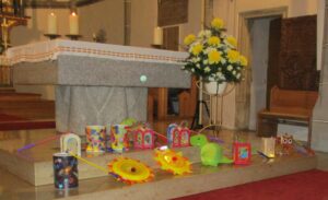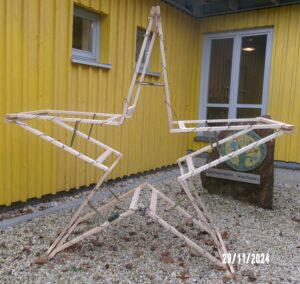 Für die Adventszeit basteln wir gemeinsam einen großen Stern aus Holz. Dieser Stern steht nun vor dem Kindergarten.