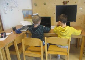 Die Kinder der Frösche-Gruppe bauten einen Teil der Gruppe in ein Büro um. Mithilfe der Mitarbeiter und der Eltern wurden alte Computer und Laptops gefunden, an denen die Kinder "arbeiten" können. Mit Ordner, Stifte, Locher, Kleber uvm. wurde das Büro ausgestattet.
