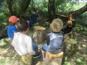 Zu unserem Kindergarten gehört ein naturnaher Garten. Es gibt neben den Spielgeräten auch viele Bäume und Sträucher zum Klettern und Verstecken, die im Sommer Schatten spenden. Kleine Tiere wie Käfer, Schnecken und Raupen können im Garten ebenso beobachtet werden, wie Vögel und Eichhörnchen. Bei unserer großen Weide gibt es eine neue, gemütliche Sitzecke aus Holzstämmen, die uns Lukas Opa gespendet hat.