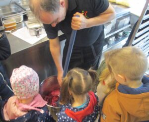 Wer und wo und wie wird das tägliche Mittagessen zubereitet. Kinder der Krippe und des Kindergartens besuchen die Kinderküche Passau. Diese liefert uns das Mittagessen und befindet sich gegenüber dem Kindergarten - im Kurgästehaus. Der Küchenchef, Herr Andreas Radspieler, zeigte uns die Küchenutensilien und bereitete für uns einen Beerenquark zu.