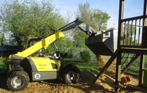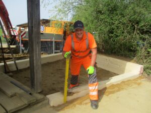 Die Gemeindearbeiter kamen in den Kindergarten um mit einem Bagger, Werkzeug und viel Muskelkraft den Sandkasten mit großen Brettern und Balken zu erneuern.