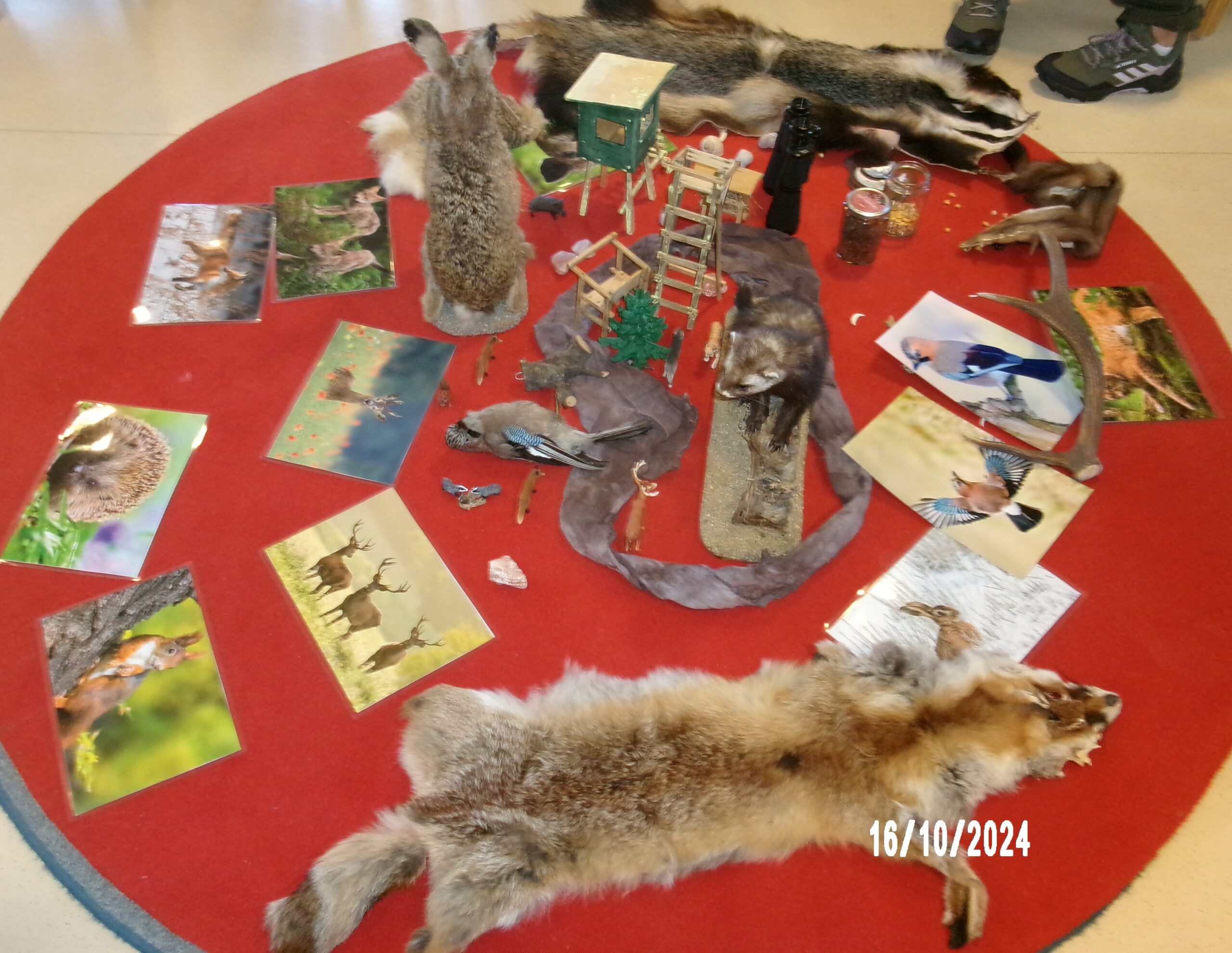 Die Jägerin Karin Roll besuchte uns im Kindergarten. Mit vielen Utensilien bauten wir gemeinsam einen Wald und erhielten so sehr viele, interessante Informationen.