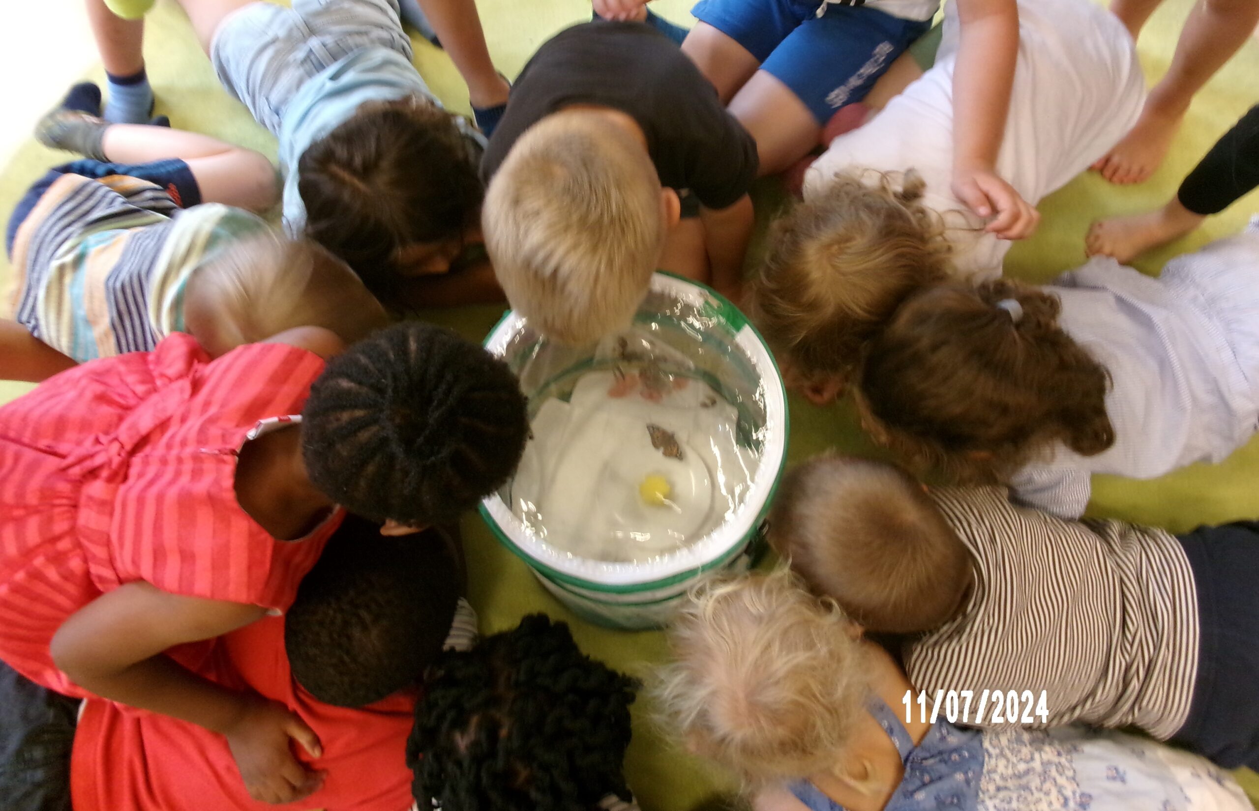 Interessiert beobachten die Kinder die Entwicklung von der Raupe zum Schmetterling.