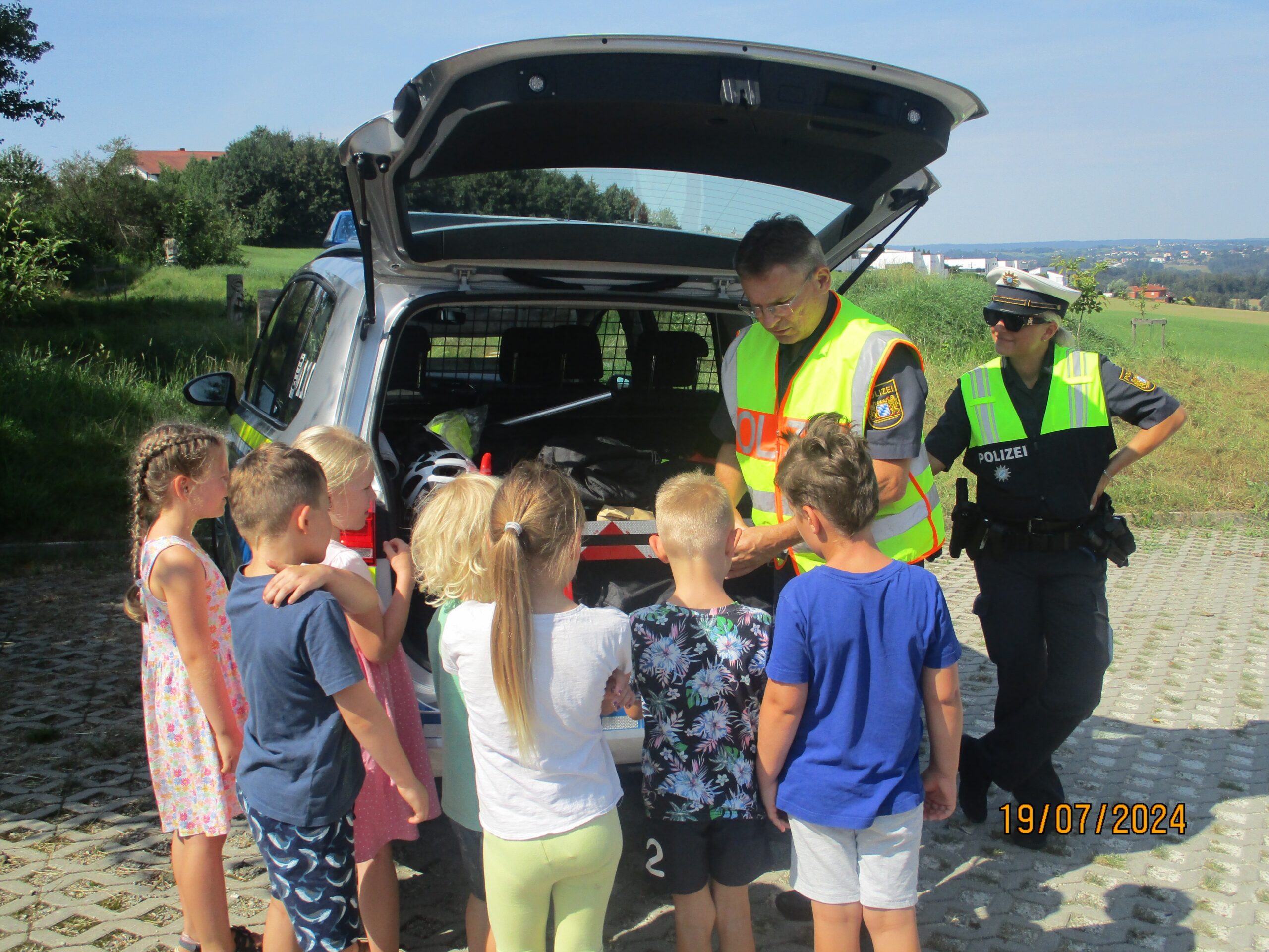 Schließlich wurde den Kindern die Ausrüstung im Polizeiauto gezeigt und erklärt.