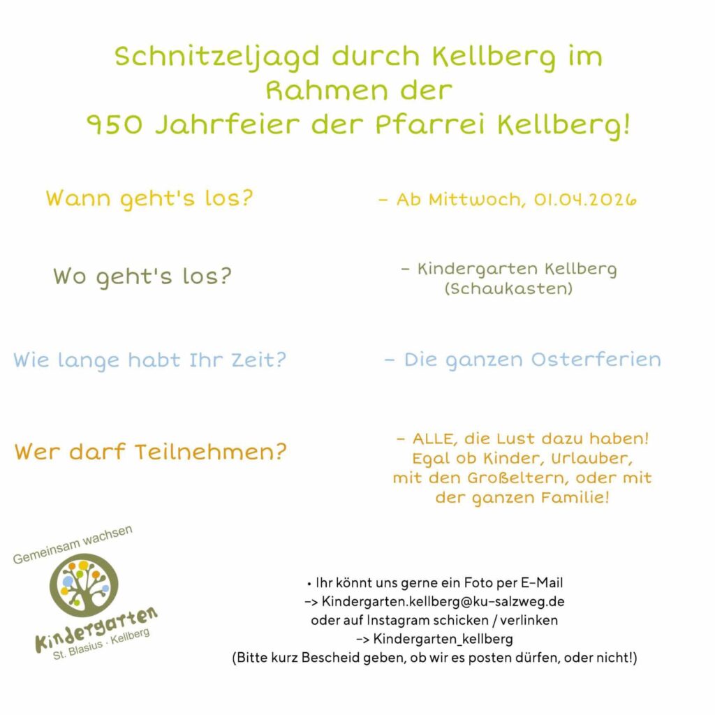 Ihm Rahmen der 950-Jahrfeier der Pfarrei Kellberg veranstaltet der Kindergarten eine Schnitzeljagd durch Kellberg. Mitmachen kann JEDER!